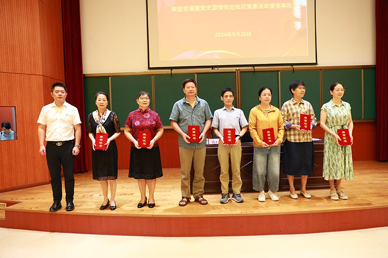 来源:萧山老年大学 发布时间:2024-09-27为庆祝中华人民共和国成立75周年,深入学习领会党的二十届三中全会精神,激发广大老党员积极投身中国式现代化建设,9月26日上午,萧山老年大学在三楼阶梯教室举办微型党课暨党史国情和党纪知识竞赛活动颁奖典礼。校临时党总支委员、各系支部书记、委员、班级党小组长以及获奖人员共70余人参加。校办公室副主任蔡锋主持会议。