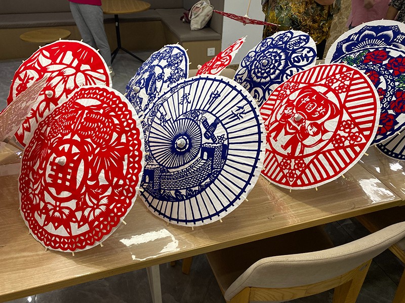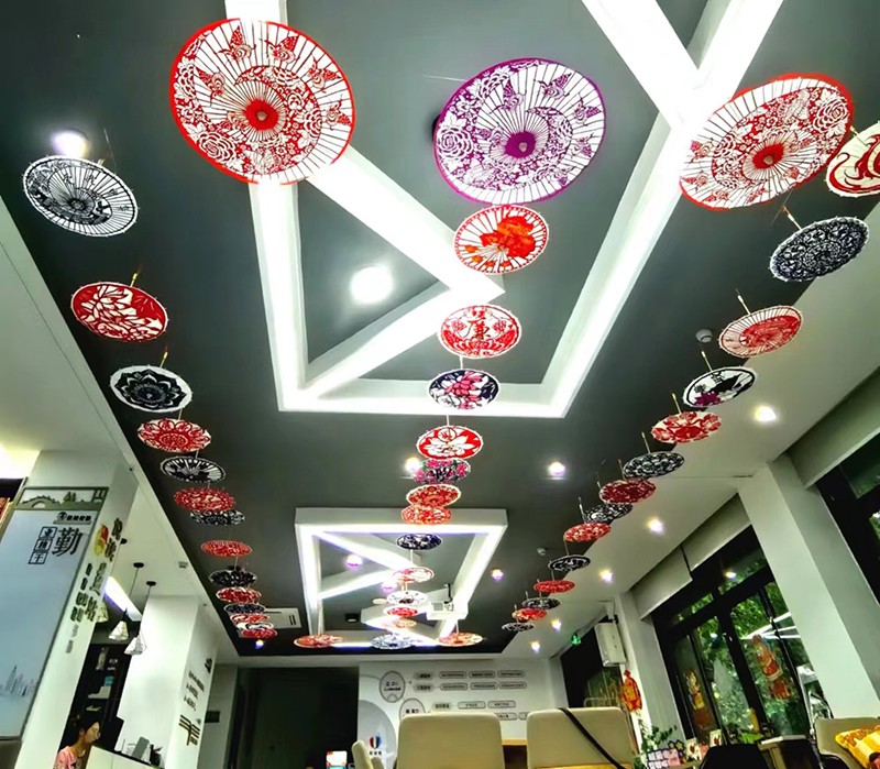 在湘湖未来社区的大堂四周,40幅反腐倡廉挂轴式剪纸作品主题深刻,寓意深远。城厢街道党群服务中心,46把贴有龙年迎国庆、清正廉洁剪纸图案的油纸伞古朴怀旧、韵味十足,有一伞一韵之美,真正能感受到中国剪纸传统工艺的精美。