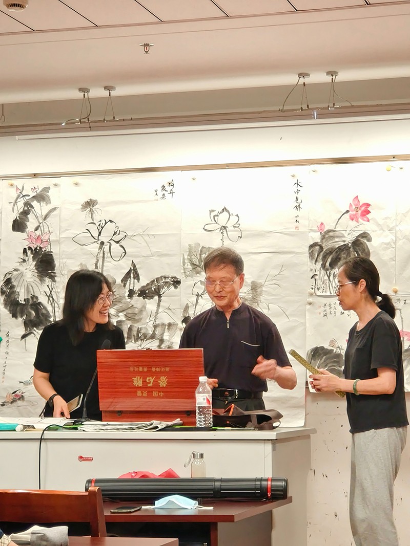 李人鼎自2005年进入萧山老年大学学习国画以来,经过多年的不断学习和努力探索,现在已是省老年书画研究会会员,多次参加省市区的书画大赛并屡屡获奖。平时他会跟同学们互相交流探讨画技,鼓励新学员,并指出画中不足的地方。现在由于年龄和身体原因,不能继续在校学习,但他认为学习和弘扬国画艺术的精神必须像接力棒似的一棒接一棒接力下去,于是萌生了用绘画用具赠优秀同学的想法。李人鼎希望得到这些绘画用具的同学,在单老师的悉心指导下,技艺精进,能为传承和弘扬国粹作出自己的努力。