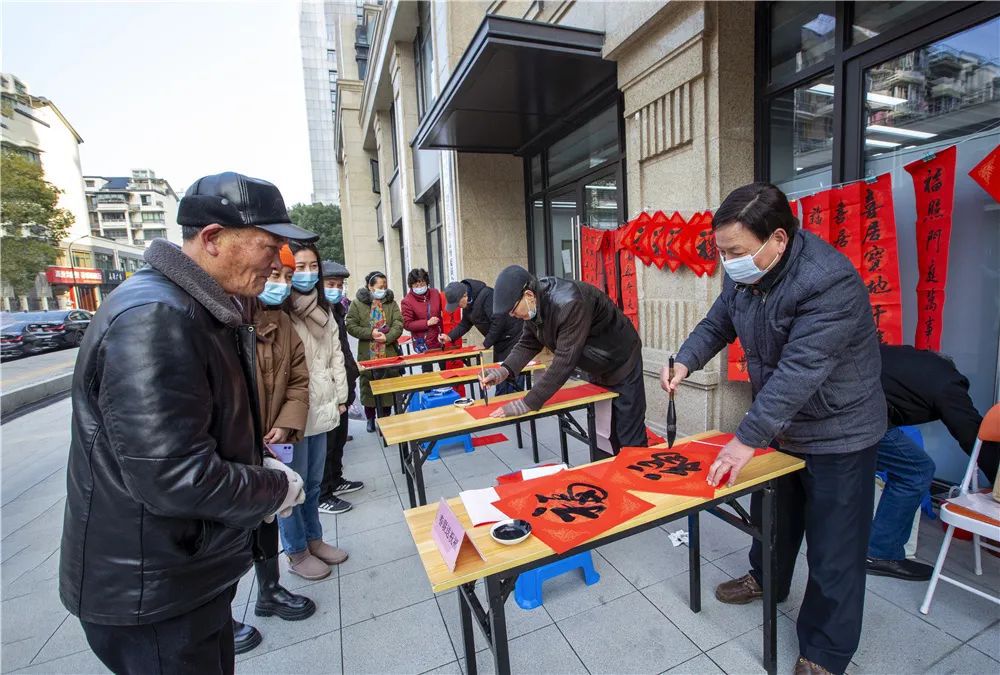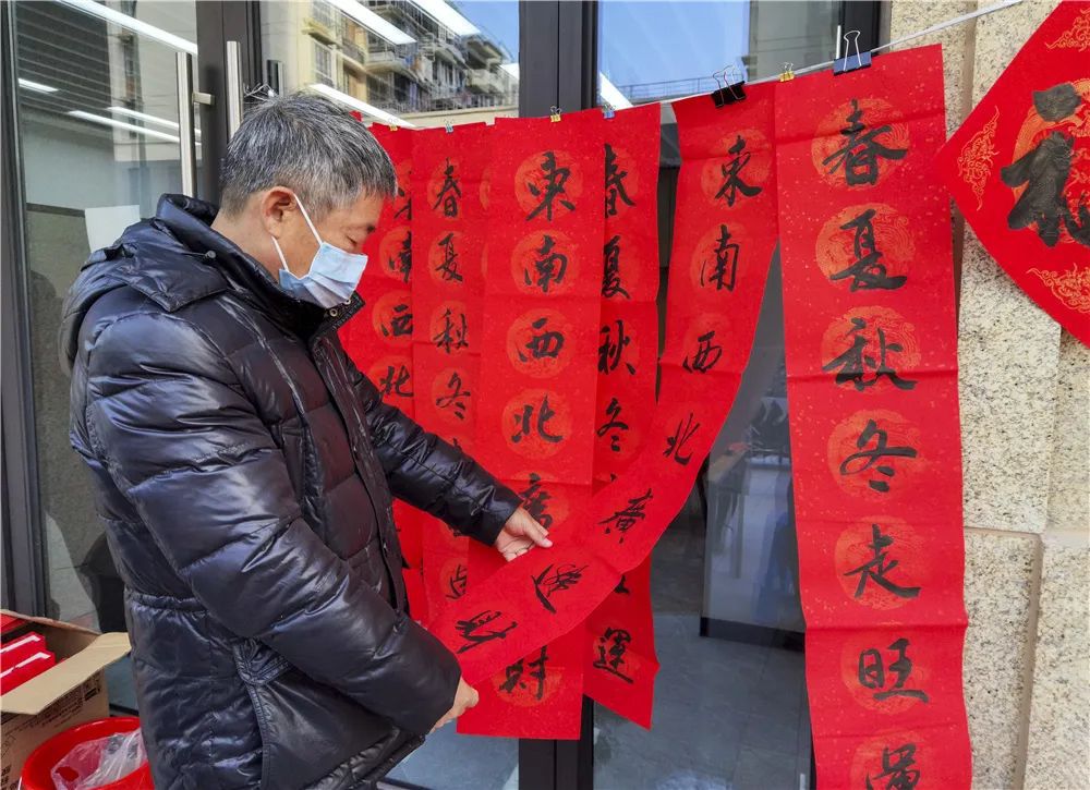 活动现场,四张桌子依次排开,红纸、笔墨一应俱全,老同志们顶着寒风挥毫泼墨,不一会儿,一幅幅散发着清新墨香的喜庆大红春联呈现在人们眼前。居民们一边欣赏书法创作,一边品评春联寓意,不时翘起大拇指连连称赞。